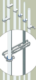 The MASTER Clamp® water pipe fitting system is based on one basic water pipe fitting, which can be supplied with liners to fit 1/2", 23 mm og 3/4" pipes. The basic water pipe fitting consists of two halfs easily assembled with one screw. A distance piece allows for the water pipe to be 40 mm offset from a wall or a sidepanel. Drill clamps in different designs are available for ½" og 1" water pipes. The drill clamps have an hexagonal interior fixing the nut when mounting. |